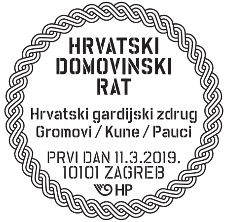 HRVATSKI DOMOVINSKI RAT – GARDIJSKE BRIGADE Žig prvog dana je u uporabi 11. i 12. 03. 2019. u poštanskom uredu 10101 Zagreb.