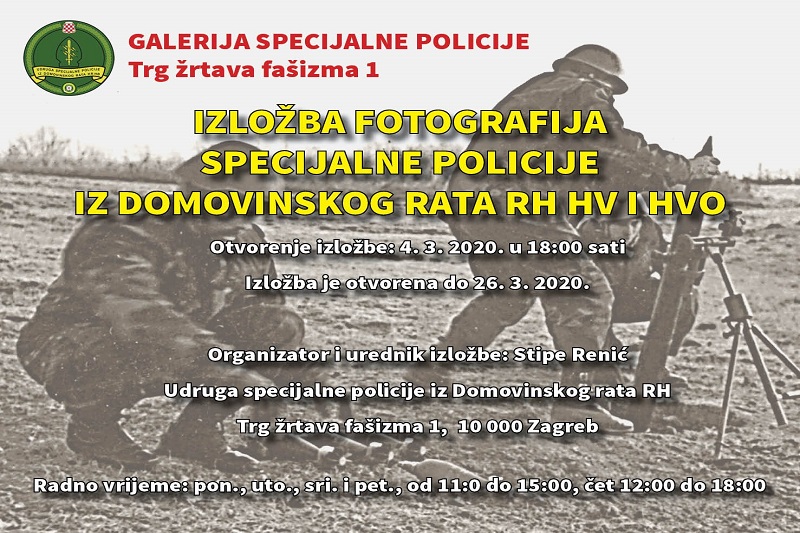Pozivamo vas na otvorenje izložbe fotografija Specijalne policije iz Domovinskog rata RH HV i HVO koja će se održati 04. ožujka 2020. godine u 18:00 sati u Galeriji Specijalne policije (Trg žrtava fašizma 1, 10 000 Zagreb). Organizator i urednik izložbe je Stipe Renić.