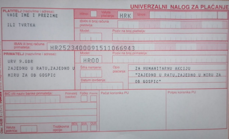 Primatelj: URV 9. GBR VUKOVI - ZAJEDNO U RATU, ZAJEDNO U MIRU ZA OB GOSPIĆ IBAN: HR2523400091511066943 PBZ banka Svrha uplate: Za humanitarnu akciju „ZAJEDNO U RATU,ZAJEDNO U MIRU ZA OB GOSPIĆ“ Za uplate iz inozemstva BIC (SWIFT) code: PBZGHR2X