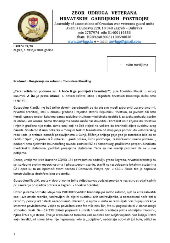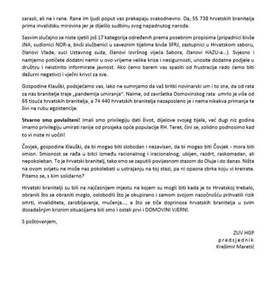 Gospodine Klauški, ne baš toliko davnih devedesetih pa da ste sve mogli zaboraviti upravo smo mi, hrvatski branitelji, stali u obranu građana i zajedno stvorili Republiku Hrvatsku, za javnost bili smo heroji, upravo onakvi kakvima danas zaslužno titulirate medicinsko osoblje i, za svaku pohvalu, stožer za obranu od korone. Samo zlonamjerna osoba može nas dovoditi u kontekst onih kojima do Hrvatske i njenih građana nije stalo, samo onaj koji ne želi vidjeti ne uočava da branitelji dijele sudbinu svog naroda. Solidarnost smo pokazali u mnogim teškim trenutcima od skupljanja pomoći do volonterskog rada kada je trebalo pomoći poplavljenima u Gunji, čišćenje snijega gdje god je zatrebalo bilo da se radilo o Splitu, Zagrebu ili Žumberku… gasili požare, čistili podmorje, raščišćavamo nakon potresa…, poduprli smo djelatnike Imunološkog zavoda, radnike RIZ-a i Kamenskog, pružili smo potporu Sindikatu medicinskih djelatnika, podržali prosvjetne djelatnike…Tada su nas mediji prozivali da se u sve petljamo.