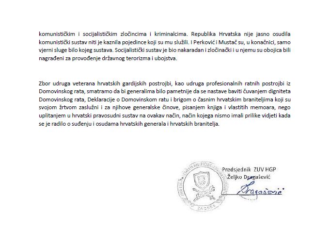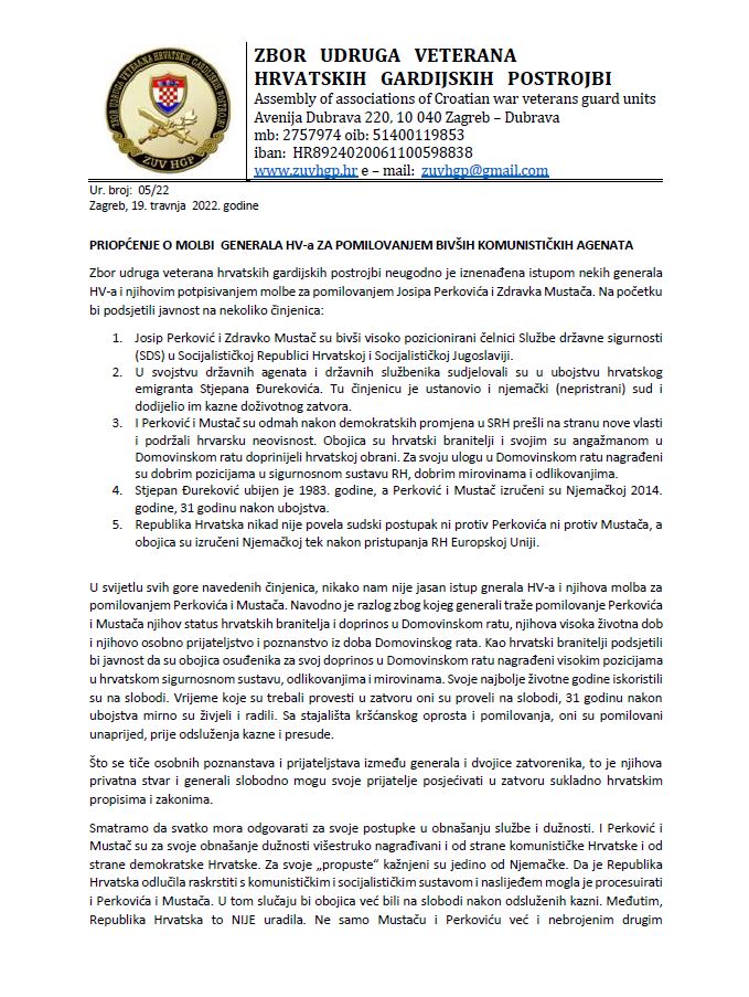 Zbor udruga veterana hrvatskih gardijskih postrojbi neugodno je iznenađena istupom nekih generala HV-a i njihovim potpisivanjem molbe za pomilovanjem Josipa Perkovića i Zdravka Mustača. Na početku bi podsjetili javnost na nekoliko činjenica: