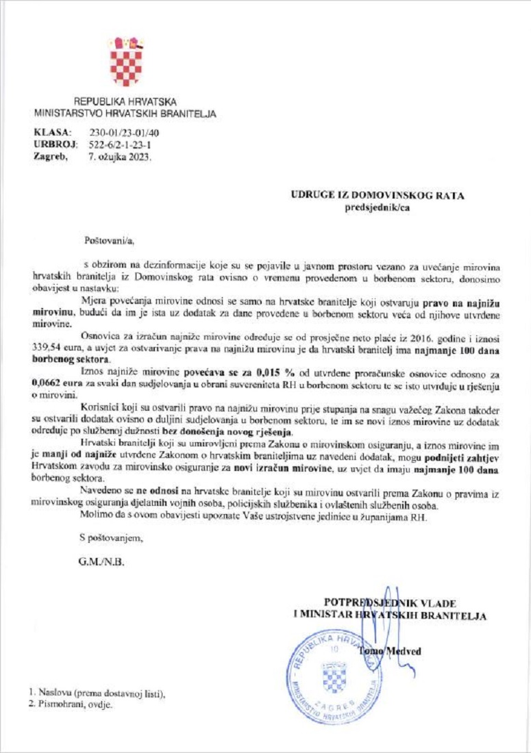 Dopis Ministarstva hrvatskih branitelja vezano uz pojavu dezinformacija u javnome prostoru.